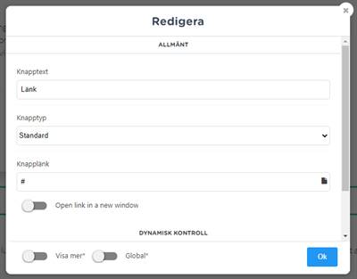 Utöver att välja destination kan du även byta knapptext, knapptyp(utseende) och välja ifall länken ska öppnas i samma fönster eller i ett nytt fönster